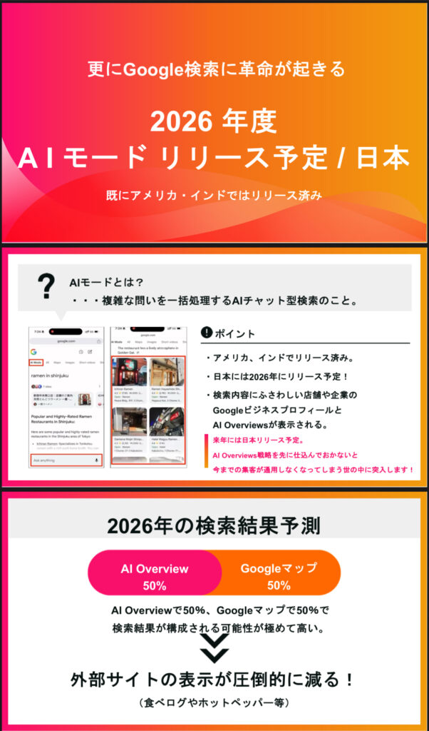 検索結果画面のほとんどが、マップとAIによる回答に支配されるため、店舗情報の露出方法が大きく変わります。